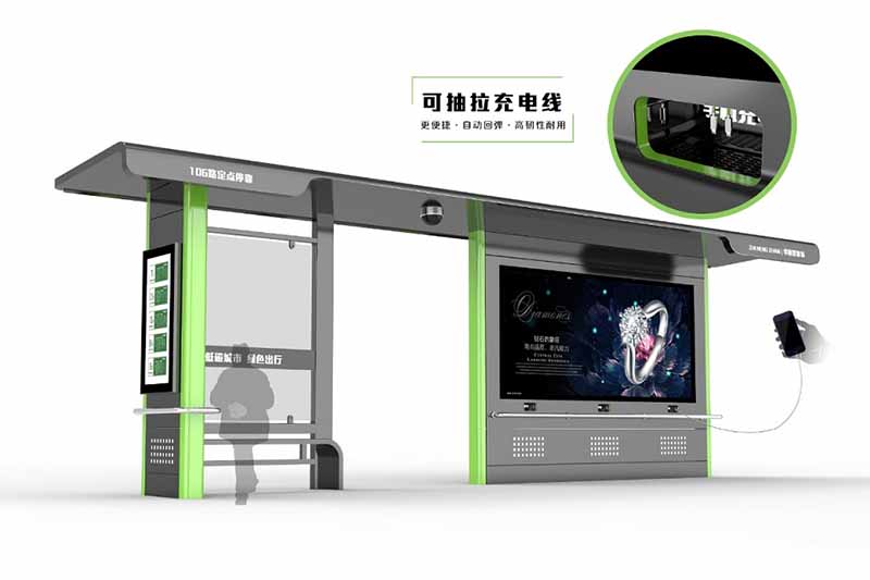新型的智能公交候车亭设计会设有USB接口的充电插头,配备多种充电接口,可以让乘客在等车时给手机、平板电脑等移动电子设备应急充电,解决了出门在外电子设备没电的烦恼。