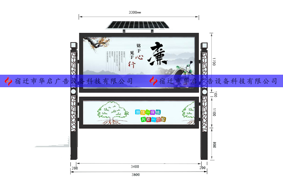 ◇ 电器配置:太阳能供电系统、高亮防水LED灯条、滚动画面系统、远程LED显示屏、微电脑时间控制器、漏电保护器、视频监控、手机USB充电等;